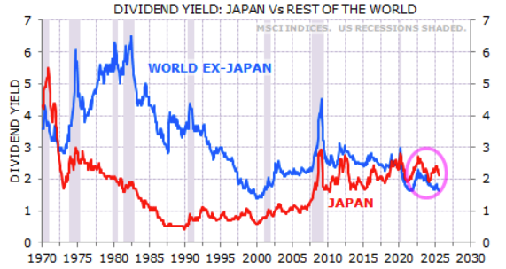 Escaping secular stagnation points to higher rates in Japan. Gerard Minack points out that false dawns have occurred below, so policy makers are willing to stay behind the curve. Changes in the economy are occurring: the equity-bond correlation flipping positive indicates a return to macro normality; stronger nominal growth is a tailwind for corporate sales and credit growth; the stock of credit is now rising at a solid pace; corporates have improved their allocation of capital; EPS over the past decade has matched the rest of the world; and the country now offers a higher dividend yield than its peers for the first time in fifty years. There’s a lot of changes, but they’ve yet to be rewarded, and Japanese equities now trade at a big discount.