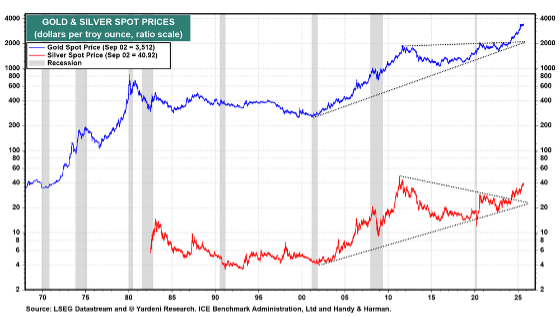 Ed Yardeni turned bullish on gold last year when the spot price of the shiny metal decisively rose above $2,000 per ounce (chart). He attributed this new bull market in gold to Russia's invasion of Ukraine in February 2022. In response, the United States and its allies froze the international reserves of Russia's central bank. That convinced the central banks of countries with autocratic governments, which are naturally hostile to the US, to increase their gold purchases. Earlier this year, when the price of gold was slightly below $3,000, Ed projected that it might remain in the rising channel that started in late 2023, reaching $4,000 by the end of this year and $5,000 by the end of 2026 (see chart below). So far, so good. Today, the spot price of gold broke out of a recent consolidation pattern to a new record high of over $3,500. The nearby futures contract just hit $3,600.