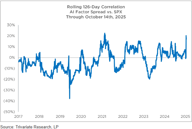 While there are plenty of high-quality AI-exposed stocks to own, the challenge is that many non-Tech names have also become correlated to the AI trade. Trivariate screened for stocks with low correlation (<0.2) to their AI Semiconductors basket, that are up >10% in the past 6 months, top-half quality and beta <1 - identifying 28 stocks with a m/cap >$50bn. Given the recent huge moves in speculative names, Trivariate also advises preparing a sell/short list for a potential market rollover. They highlight 24 stocks ($1bn+ m/cap) that are up >100% in 6 months, in the most expensive EV/sales decile and the bottom half of their quality model, companies with high short interest and lower 2026 EPS estimates than at the start of the year, meaning the recent big moves in stock prices are despite a deteriorating nearer-term fundamental outlook.