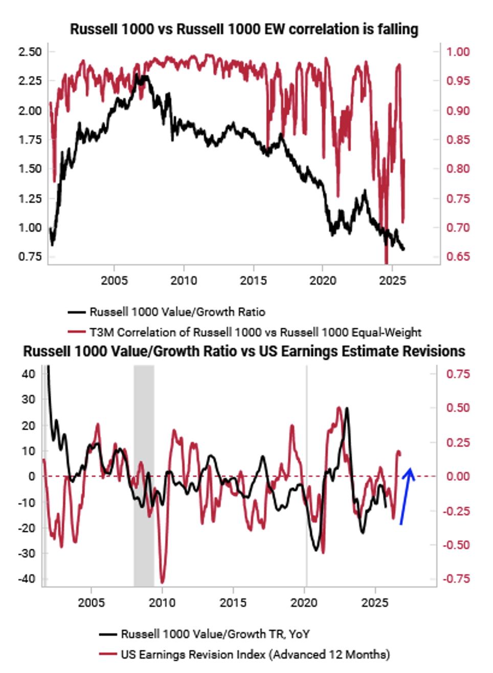 Tian Yang is changing his long-held bias against value stocks and recommending a shift to overweight value vs growth. He points out that he is finally seeing alignment across A) market behaviour, B) the macro-outlook, and C) bottom-up fundamentals. On his indicators, today's set up is as good as it has been since the GFC for value to outperform. US earnings estimate revisions have broadened since Liberation Day, which has historically been indicative of value vs growth outperformance over the next 12 months (first chart below). At the same time, he notes a sharp fall in the correlation of the Russell 1000 market cap weighted index vs the equal weighted index. As the second chart shows, this correlation collapse has often marked a low in the value-to-growth ratio historically. Tian is also seeing evidence of a rotation into value stocks over the past couple of months.