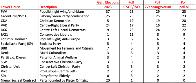 Based on the latest three polls, the Dutch General Elections could end up in a close finish between the five largest political parties (see table). Although the TweeVandaag poll still puts PVV clearly in the lead, the other two polls show an accelerating loss of Geert Wilders’ Freedom Party, which has been banned as a potential coalition partner by most other parties. Maarten Verbeek notes that VVD appears to be the main beneficiary of the Freedom Party losing support, whereas the progress in the polls of D66 continues. Maarten reiterates his view that – based on the polls – the most logical new coalition would be one between GroenLinks/PvdA, D66, CDA and VVD. With the first three parties being left of the centre, this could mark a clear break with the policies of the outgoing cabinet. In view of the meaningful differences in the election programs of these four parties, a new coalition by Christmas would be quite the surprise.