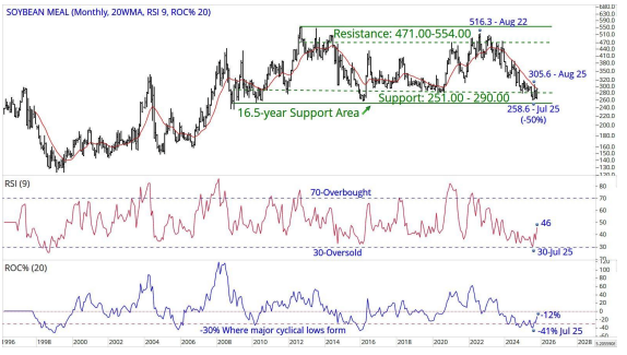 Spot soybean meal (USD293.90) has been ranging for many years, finding support at 251.00–290.00 and resistance at USD471.00–554.00. The support area has been intact for 16.5 years and in recent months it has been tested again. With spot soybean meal emerging from the support area, Chris Roberts wants to put on an initial long position. Go 50% long at market. The initial stop loss is a daily close below USD256.00. At the same time, he will exit his long spot soybean oil long position.
