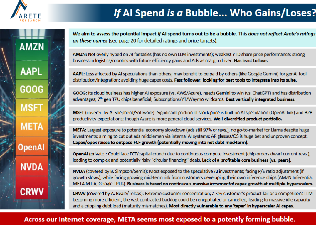 Arete reviews the surge in Big Tech capex, with their forecasts 20-40% above consensus. They note the mismatch of long-term deals and shortening tech life cycles and accelerated depreciation, believing it will require Big Tech to address new TAMs or target each other’s businesses. Their report weighs whether this spending boom will prove to be a “bubble” and identifies who is most exposed. Arete sees Alphabet, Meta, Apple and Amazon all seeking to “own” a customer interface layer as GenAI products move into mainstream adoption.