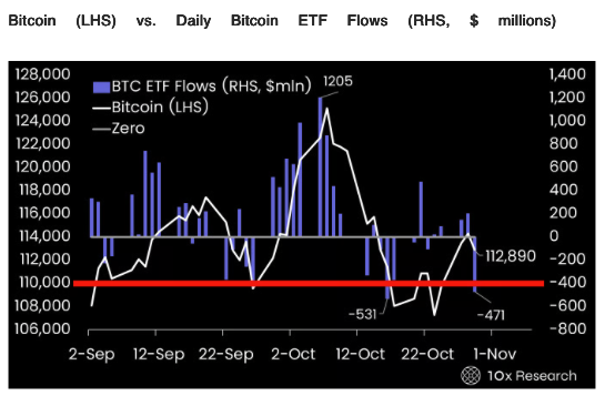 Bitcoin trades on shifting sentiment and positioning. The past five months haven’t been because demand disappeared, but rather because a massive transfer has been taking place beneath the surface, with early-cycle OG holders selling and new institutional capital steadily absorbing supply, keeping Bitcoin range-bound. If ETF buyers return following the China-US meeting and the latest FOMC decision, Bitcoin can resume its rally. However, Powell’s slightly hawkish tone and decision to delay QT’s end could keep ETF demand sidelined at a moment when it matters most. As long as Bitcoin holds the $110,000–$112,000 support zone, the 10X Research team are prepared to stay aligned with upside momentum, but a break below $110,000 would trigger a reduction in long exposure – that level remains their hard stop.