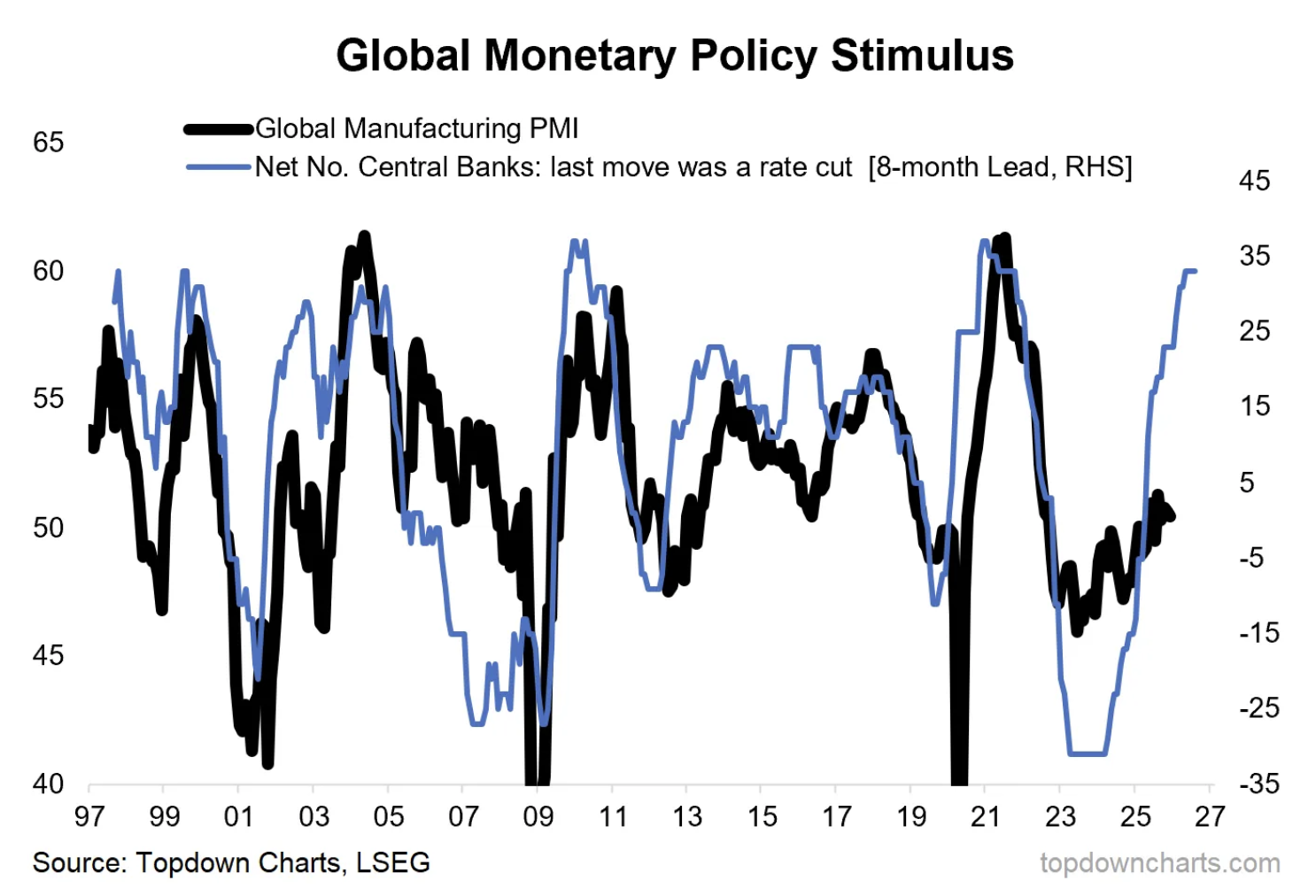 Callum Thomas says that the biggest story in macro of the 2020s will echo on into 2026, with monetary policy going from tailwind in 2020 to tightening in 2023, and back to tailwinds again now. This is coming at a time where nascent signs are showing an upturn in the macro pulse from previous stagnation (e.g. the global manufacturing PMI). Callum points out that the path laid out by the monetary policy leading indicator in the graph below is a very interesting one indeed, and it’s not the only sign. The OECD leading indicators are also pointing to a major improvement in the global economy. Aside from monetary tailwinds there are several other factors working into this thesis such as fiscal stimulus, thematic capex, inventory cycles, and so-on. But there are a couple of logical flow-on effects we need to watch should this play out as planned. One key flow-on will almost certainly involve inflation resurgence.