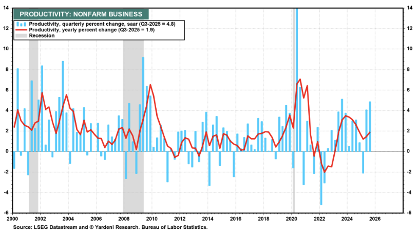 The latest Bloomberg Businessweek had the AI bubble as the cover story. Some may take this as a sign to be nervous, but from a contrarian perspective Ed Yardeni argues that it’s bullish as it signals the bubble won’t burst, if it even exists. People have AI fatigue. Ed recently recommended underweighting the Mag-7 as their AI arms race is forcing them to spend billions on infrastructure that could quickly become obsolete, and that could be unprofitable as competitors squeeze their margins. Ed believes the air can be let out of the AI capital-spending bubble over time without it bursting and causing a recession. Meanwhile, AI is starting to boost the productivity of the users of this tech, especially the S&P 500’s Impressive 493. Non-farm business sector labour productivity increased 4.9% (saar) in Q3-2025, as output increased 5.4% and hours worked increased 0.5% (see chart). Q2-2025 productivity was revised up from 3.3% to 4.1%. These are striking numbers!