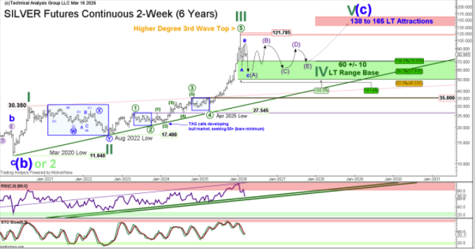 With the attainment of the new low under 78.06, the Technical Analysis Group have closed half of their NT Strategic Short position, established into strength at 95/96, and are placing a trailing stop at 87.70 on the remainder of the trade. Price action from 97.30 has yet to reveal any urgency or impulsiveness to the downside. The team are expecting near term relative outperformance in gold vs silver, and are bullish the 'RATIO' whilst above 57.59, seeking upside in the near term to 67 +/-, and 72.66+. Since raising risk, they have seen a +12% rise to 64.47. The team continues to remain long term bullish and regardless of whether or not they’re in the higher degree 4th wave, they do not expect downside under their proposed 60 +/- 10 LT Long Term Range Base, before ultimately eclipsing this year’s 121.78+ high in the resumption of the underlying bull trend, exposing their next major upside attraction levels of 138 and 165 (see chart).