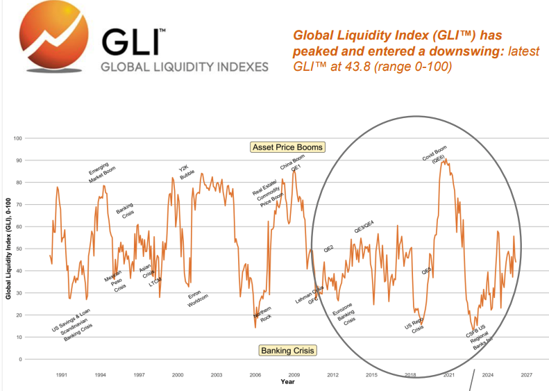 Michael Howell’s Global Liquidity Index (GLI) has peaked and entered a downswing, pushing market conditions towards a ‘Risk Off’ environment. This systemic downturn, rather than the oil spike alone, is the primary force eroding portfolio performance and explains growing stresses in private credit, as exemplified by troubles at firms like Blue Owl. While the Iran conflict-driven oil price spike acts as a negative Black Swan shock, its impact is compounded by the already weakening liquidity cycle. The Fed is managing liquidity to avoid market crashes, while the PBoC is aggressively injecting liquidity. This divergence justifies holding gold and explains why Chinese markets are at an earlier, more favourable stage of the investment cycle. With the liquidity downturn expected to last 12-15 months, the recommended strategy is to pare back credit and US tech exposure. Investors should rotate towards defensive assets like commodities (gold, oil), gradually add to mid-duration Treasuries, and increase holdings in Chinese stocks.