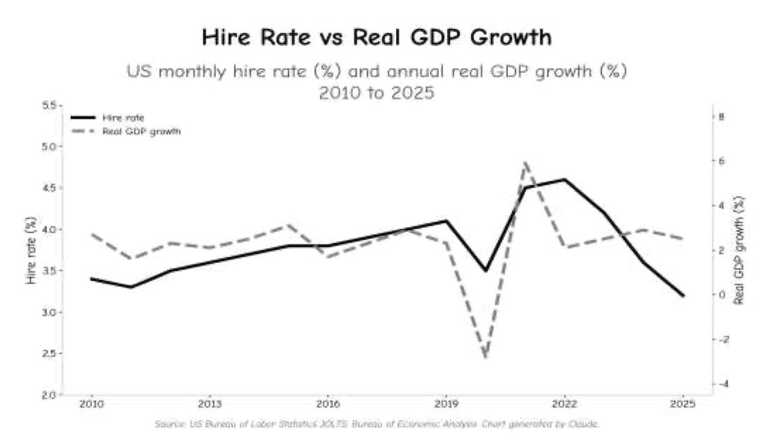Paul Krake’s latest report rebukes the argument that AI-driven job displacement will be absorbed by new industries generating new work. It is an argument that Paul claims is taken seriously in policy circles, investment committees, and corporate boardrooms, yet it is deeply flawed. The hiring data already shows this, with the hire rate having falling 29% since the post-pandemic peak yet GDP has grown by 8% (see chart). AI is amplifying the pattern that labour is not required for growth. Just a 1 in 10 displacement of knowledge workers, which represent 45% of the US labour force, is enough to push unemployment towards 9% without a recession. Paul claims that the frameworks used to detect labour market stress are not built for an economy where growth and hiring decouple permanently. By the time the unemployment rate confirms what the hire rate has been signalling since 2022, the adjustment will have been compounding for a decade. 10% unemployment in the years ahead is not a tail risk, it is the base case.