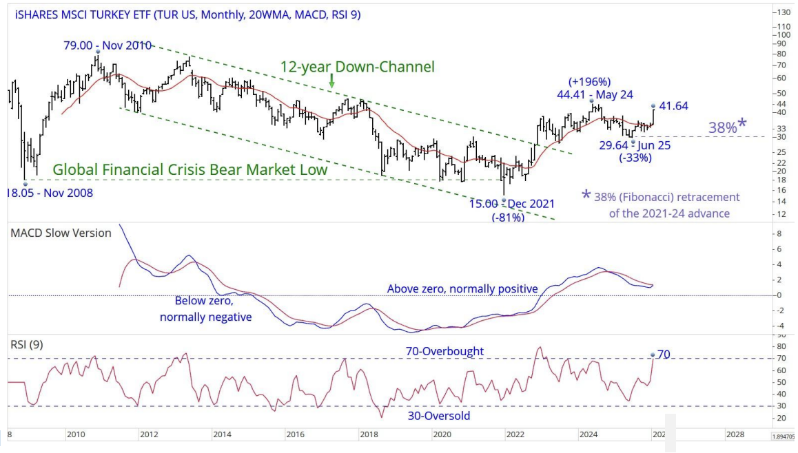 The Euro’s (€1.1416) monthly chart shows a breakout from a 17-year Down-channel, with the currency trading as high as €1.2083 in January this year, up 27% from the Sep 2022 low. Chris Roberts comments how a sustained breakout from the channel, following the 14-year, 40%+ fall in 2008-22, could potentially be very bullish. The near 6% fall from the recent high has taken the Euro back to the rising 20-month WMA and the 9-month RSI back to Neutral 50. Chris is 40% long from €1.1572 and would look to add on a break above the Jan high. His stop stays at a daily close below €1.0954.