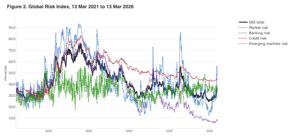 Jeffrey Young’s Global Risk Index (GRI) signals an increasingly risky macro environment, brought on by the prospect of extended disruption to Middle East energy supplies and the Strait of Hormuz. Importantly, however, a dispassionate assessment using various DeepMacro metrics suggests that actual shifts in the global macro backdrop to date are muted. The GRI has risen from what was a very low level in late February to a reading that is in the mid-30s, a level that is relatively muted by historical standards (see chart). Indeed, the rising figure is nearly entirely due to rising financial market volatility, not to credit risk or financial sector risk – increases in the latter would signal a potentially significant deterioration in the environment ahead. Whilst market expectations have worsened towards future economic growth and inflation, Jeffrey’s factors are yet to show any deviation from recent trends.